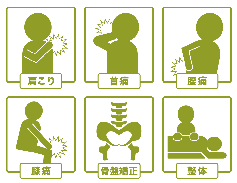 頭痛・頸椎病・ムチウチ・寝違い・肩こり・五十肩・腰痛・ぎっくり腰・椎間板ヘルニア・膝痛・手足のしびれ・坐骨神経痛・O脚・骨盤の歪み・冷え性・便秘・生理不順・全身疲労・自律神経失調症 その他、お気軽にご相談ください。